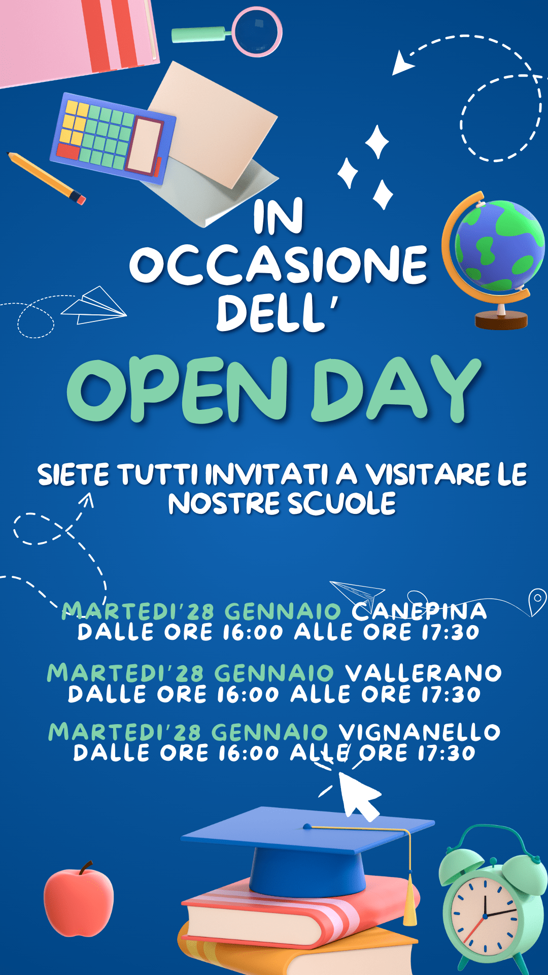 HomeOpen Day – Scuola Primaria Open Day – Scuola Primaria Tipologia Data: Gennaio 20, 2025 Siete tutti invitati ed invitate a visitare le Scuole Primarie di Vignanello, Vallerano e Canepina martedì 28 gennaio dalle ore 16:00 alle ore 17:30. Open day-Scuola dell’Infanzia Open Day – Scuola Secondaria Di I° Grado
