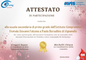 Mercoledì 22 aprile si è svolta una lezione speciale presso la Scuola Secondaria di I° di Vallerano tenuta dai rappresentanti della sezione AVIS di Vallerano e della Consulta AVIS Giovani Nazionale e Regionale Lazio.